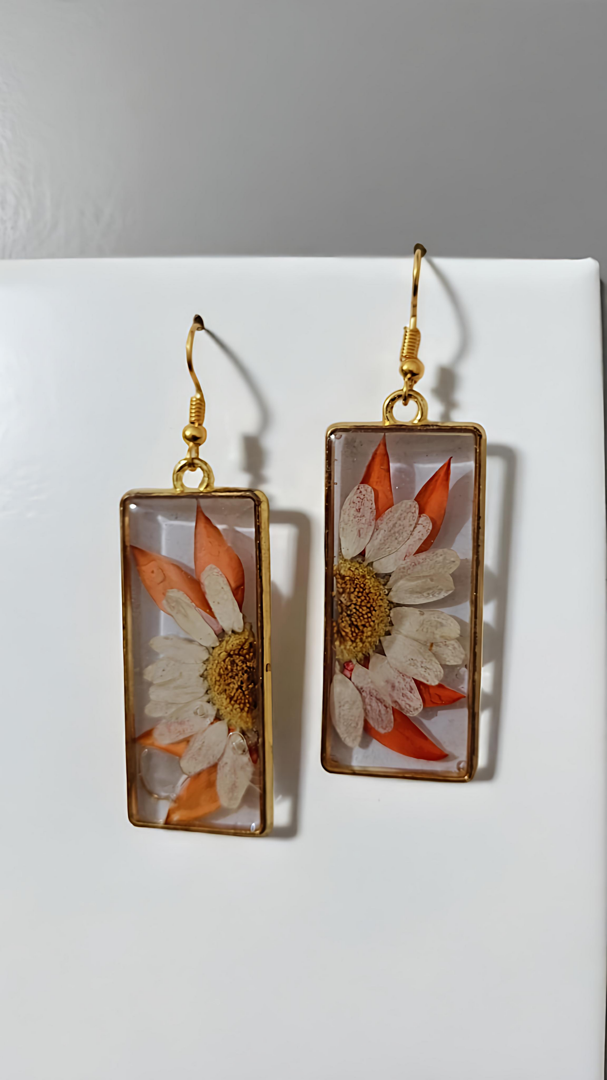 Handcrafted golden rectangular earrings with preserved red leaf petals and a white daisy flower. Lightweight, elegant, and nature-inspired—ideal for everyday charm or special occasions