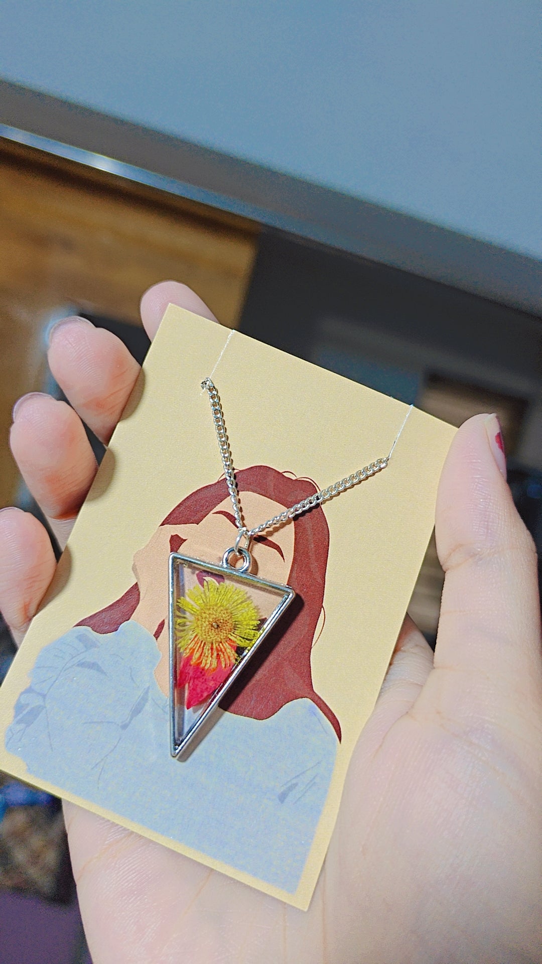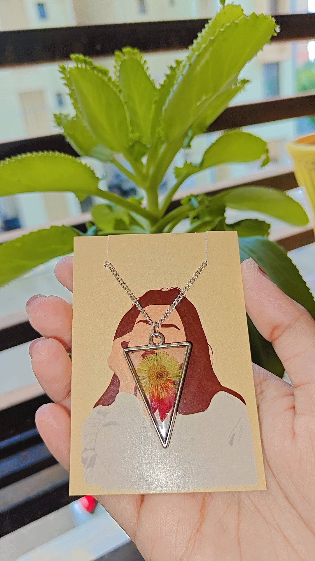 A handcrafted triangular silver bezel pendant featuring delicate red leaf petals and a bright yellow flower, beautifully preserved to capture nature’s warmth and elegance in a timeless design. 🌸