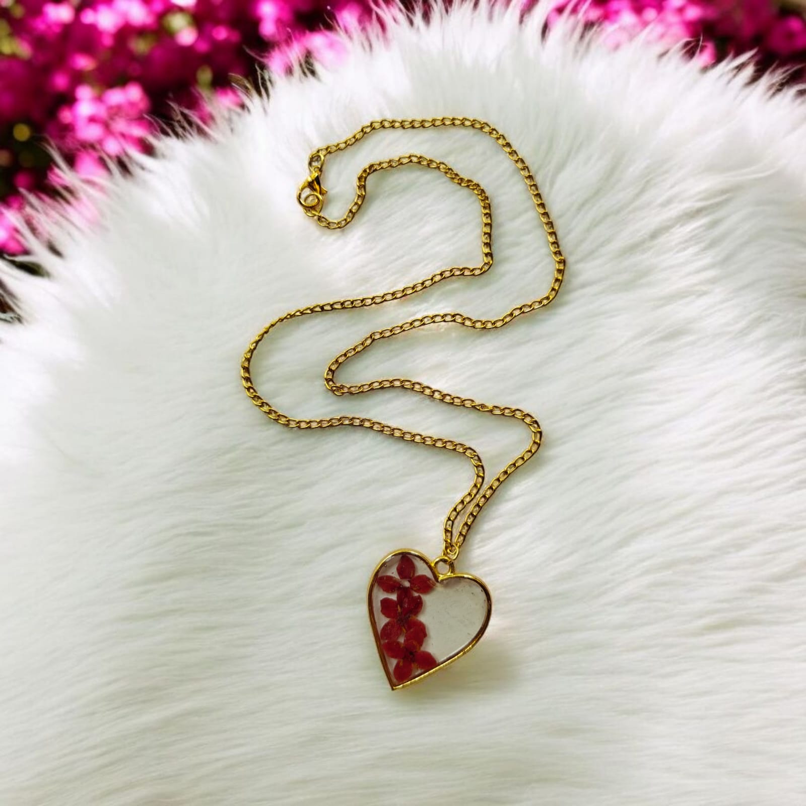 This Ruby Heart Floral Necklace features a delicate design with tiny ruby flowers encircling a heart-shaped centerpiece, all set within a refined golden bezel. Expertly crafted, it combines the rich red hues of rubies with the warm glow of gold, making it an elegant accessory that enhances any outfit with subtle sophistication and timeless charm.